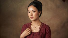 A captivating portrait of a young Indonesian woman wearing a maroon lace kebaya, accessorized with traditional gold jewelry, against a warm, textured background. Her refined hairstyle and graceful expression exude a sense of cultural pride and elegance. The intricate lace detailing and the harmonious combination of traditional attire and contemporary styling reflect the rich heritage and modern sophistication of Indonesian fashion. Ideal for themes related to traditional clothing, cultural beauty, heritage, and formal portraits.