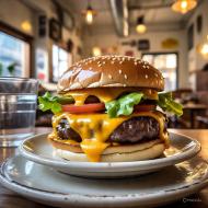 Delicious cheeseburger with melted cheddar, fresh lettuce, and tomato on a sesame bun, served in a cozy restaurant setting.
