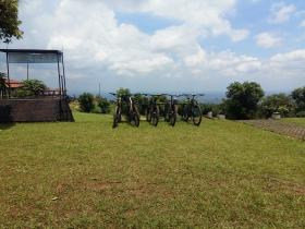 A scenic morning view at a bike park featuring several mountain bikes lined up on a grassy field. The setting includes lush greenery, clear blue skies, and a panoramic landscape in the background, creating a peaceful yet adventurous atmosphere perfect for outdoor and cycling enthusiasts.