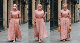 A series of three shots showcasing a stylish Indonesian Muslim woman wearing a beautiful pink patterned dress with a beige belt, complemented by a matching hijab and beige handbag. The urban street setting highlights a chic and sophisticated fashion sense, blending traditional modest wear with modern elegance. Ideal for themes related to Muslim fashion, street style, cultural identity, and contemporary modest outfits.