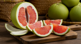 A vibrant shot of a freshly sliced Bali Pomelo (Jeruk Bali) revealing its juicy, pinkish-red flesh arranged beautifully on a rustic wooden cutting board. The thick green rind and glossy segments highlight the fruit's natural appeal, while the woven bamboo baskets in the background add an authentic tropical touch. This image perfectly captures the freshness and sweetness of this iconic Indonesian citrus fruit. Ideal for themes related to tropical fruits, healthy eating, Asian cuisine, and traditional markets.